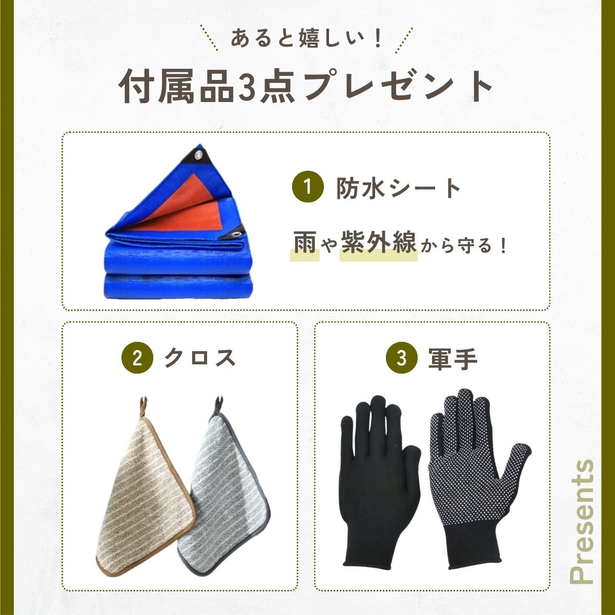 付属品つきです(軍手、ブルーシート、クロス)